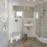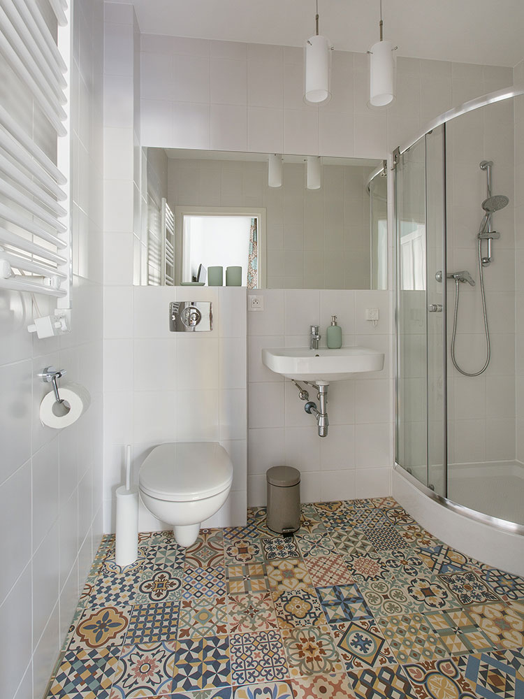 W łazience znajduje się ubikacja, prysznic, umywalka, pralka i suszarka do włosów.