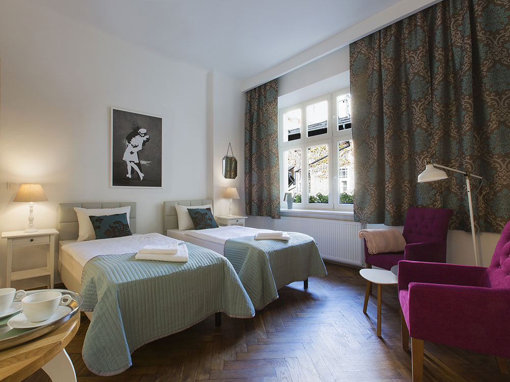 Apartament numer 12 to elegancki lokal typu studio o powierzchni 26m² przeznaczony dla 1-2 osób. Mieści się na pierwszym piętrze, w podwórku zabytkowej kamienicy na ulicy Gołębiej zaledwie 50 m od Rynku Głównego. Składa się z sypialni połączonej z miejscem do odpoczynku, wyposażonego aneksu kuchennego oraz komfortowej łazienki.