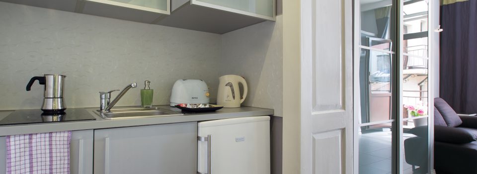 - A kitchen: fully equipped and furnished. You will find all the necessary devices: a microwave, an electric cooktop, a fridge, a toaster and a coffeemaker.