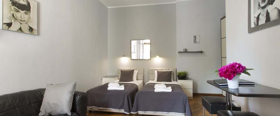 Apartment 5A is an elegant studio flat perfect for 1-2 people. It is situated on the third floor of the antique tenement in the old city centre, only 50 metres from the Main Market Square. It is fully furnished with an equipped kitchen and comfortable bathroom. Shops, restaurants, pubs, cafes, bus and tram stops, museums, cinemas, theatres are all at your fingertips. It is just one stop from the central bus and train station. It has a great connection with the city airport. Car park: guarded and paid in the distance of 100 metres in Plac Słowiański and one in front of the apartment but unguarded from 19:00 (in the evening) till 10:00 (in the morning). This apartment has a bedroom adjacent to a living room, a kitchenette, a comfortable bathroom, a corridor and a toilet room.