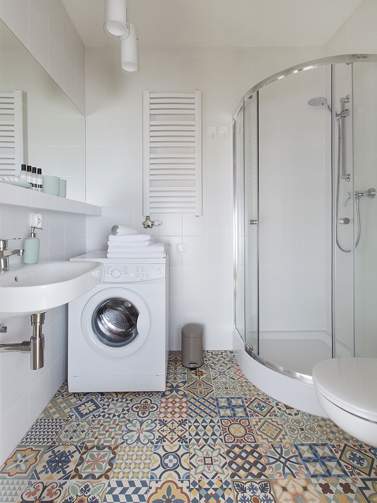 W łazience znajduje się ubikacja, prysznic, umywalka, pralka i suszarka do włosów.